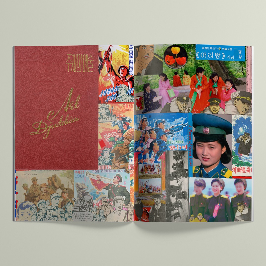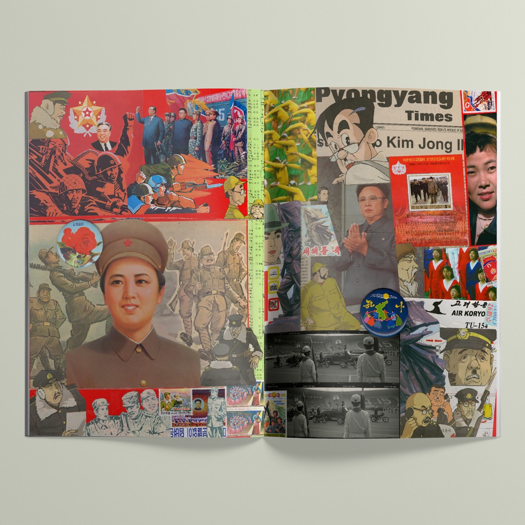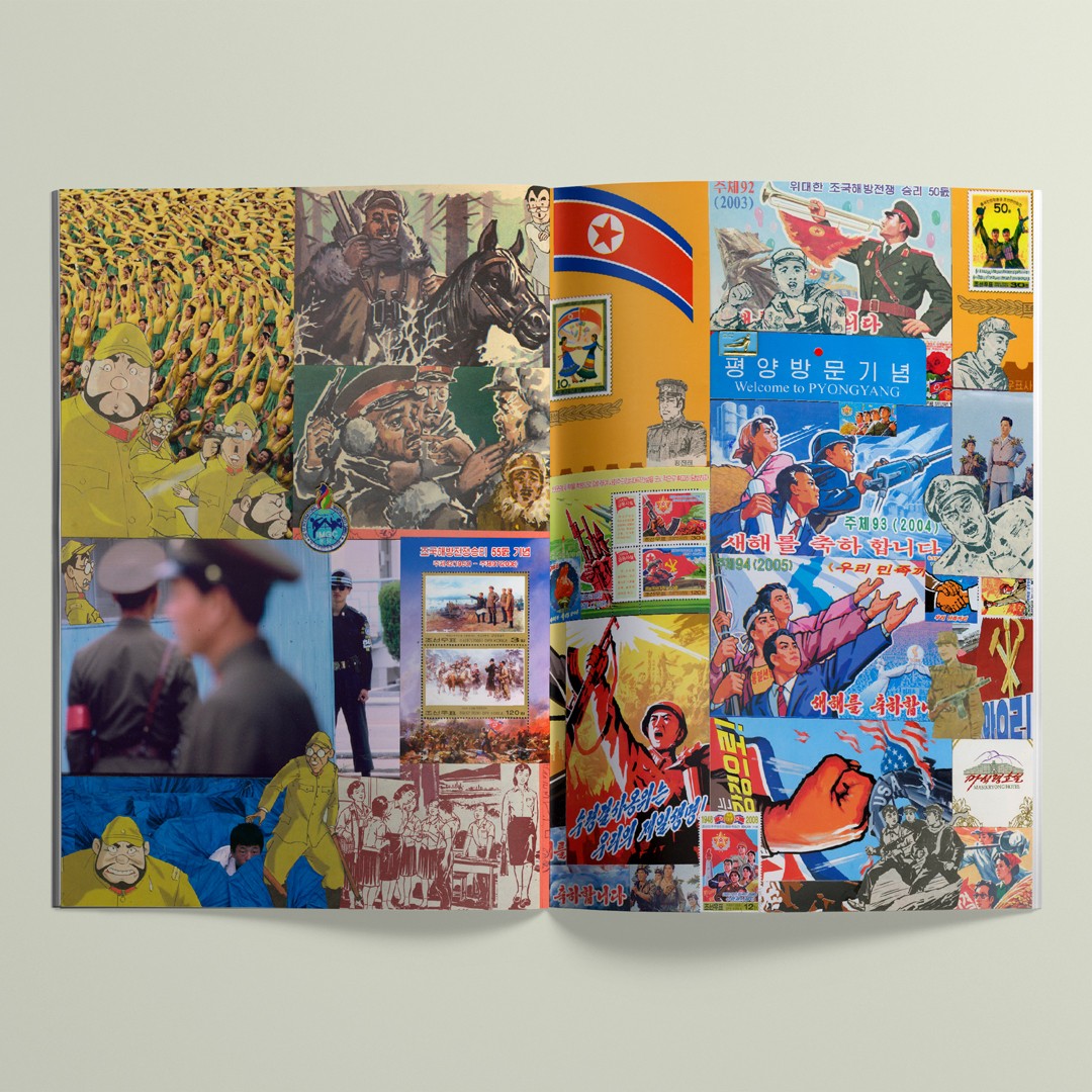 “Au terme de dix-neuf voyages entamés à partir de 1991 à Pyongyang, capitale de la Corée du Nord, le photographe et éditeur Pierre Bessard a entrepris un projet ethno-photographique composé de collages graphiques, intitulé Soleil généreux en référence à l’astre cité dans l’hymne patriotique du pays […] tandis que c’est la lune qui est au cœur de l’aegukga de la Corée du Sud […]. S’il est impossible pour l’étranger en Corée du Nord de produire des photographies à charge, montrer la démesure du régime, la docilité de sa population, et l’illusion visuelle qui sert la RPDC sont des ressorts permettant de mieux donner à voir le règne dictatorial – et comme l’a bien compris Pierre Bessard, pour cela rien de tel que de partir de la matérialité des images disponibles sur place. Les collages mêlent ainsi des planches de bande-dessinée ou des affiches, timbres et pin’s de propagande à des prises de vues faites par le photographe lorsqu’il assistait à divers événements officiels.”